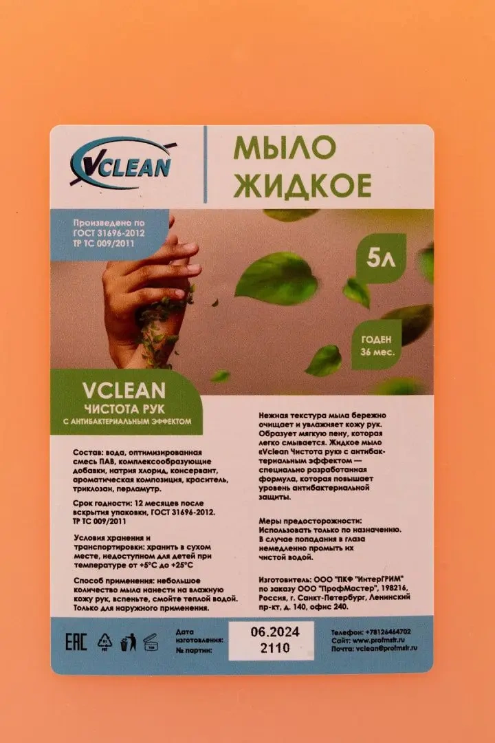 Жидкое мыло наливное Vclean 5л, с антибактериальным эффектом, канситра