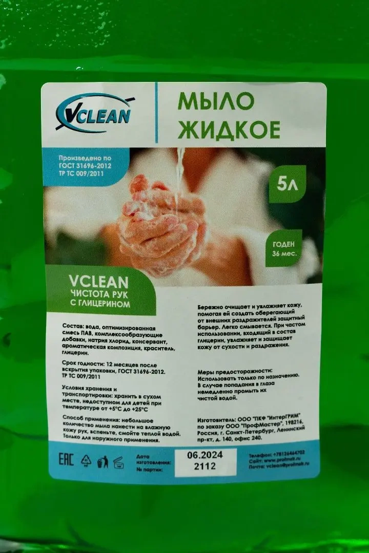 Жидкое мыло VCLEAN Чистые руки 5 литров с глицерином.Состав: вода деионизированная, натрия лауретсульфат, кокамидопропил бетаин, диэтаноламид жирных кислот кокосового масла, глицерин, натрия хлорид, ароматизатор, консервант, краситель.Срок годности 36 месяцев.