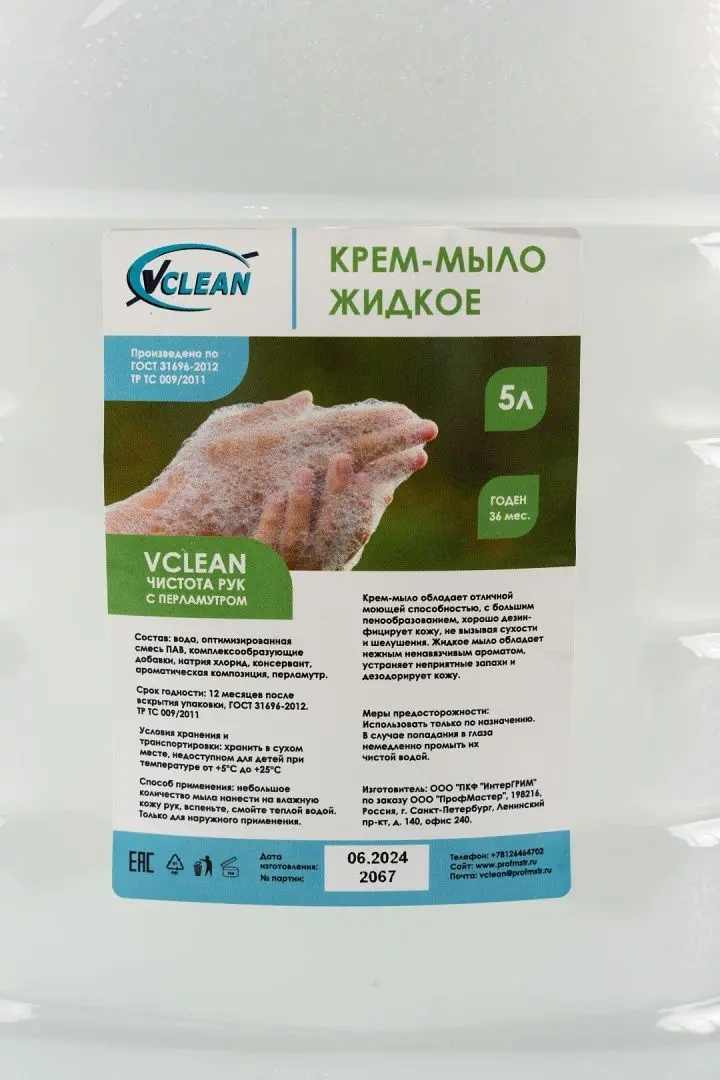 Жидкое мыло VCLEAN Чистые руки 5 литров крем-мыло с перламутром.Состав: вода деионизированная, натрия лауретсульфат, кокамидопропил бетаин, диэтаноламид жирных кислот кокосового масла, глицерин, натрия хлорид, ароматизатор, консервант, краситель.Срок годности 36 месяцев.