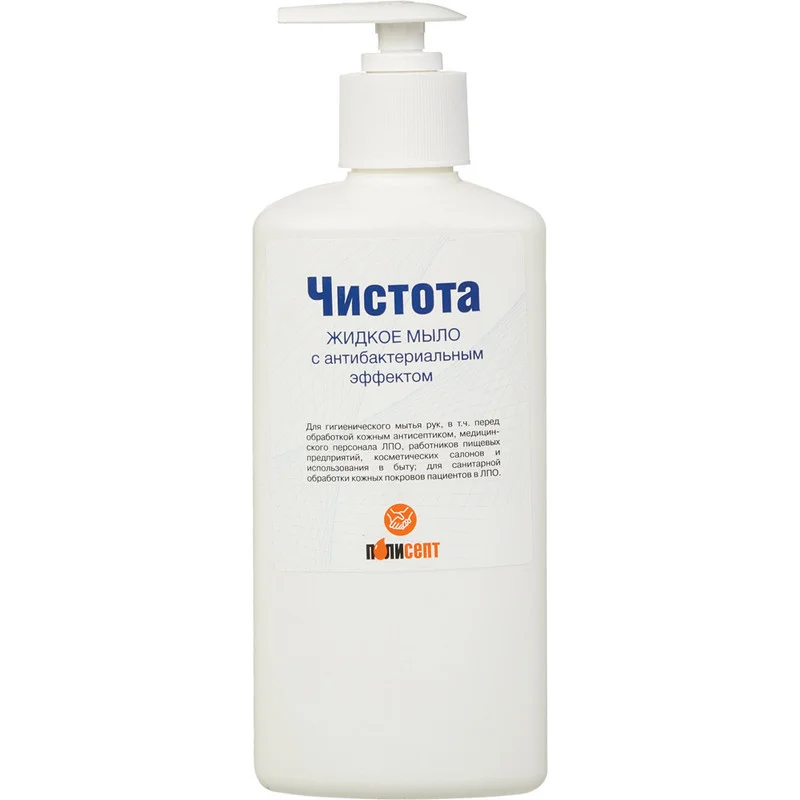 Жидкое мыло с дезинфицирующим эффектом «Чистота антисептик», содержит в качестве действующего вещества ундециленамидопропилтримониум метосульфат (тетранил У) – 1,5%, а также функциональные добавки, увлажняющие и ухаживающие за кожей компоненты. рН 1% раствора средства 5,0-7,0. Средство обладает активностью в отношении грамположительных (кроме микобактерий туберкулёза) и грамотрицательных бактерий, а так же грибов рода Кандида. Средство обладает хорошими моющими свойствами, не содержит красителей и ароматизаторов, имеет нейтральное значение рН, не раздражает кожу.