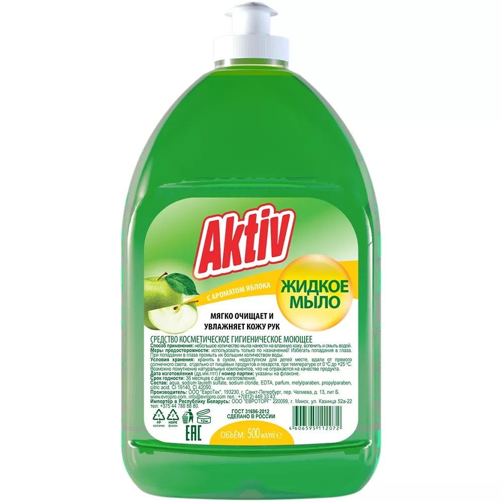 Жидкое мыло с дозатором Aktiv 500мл, яблоко, пуш-пул