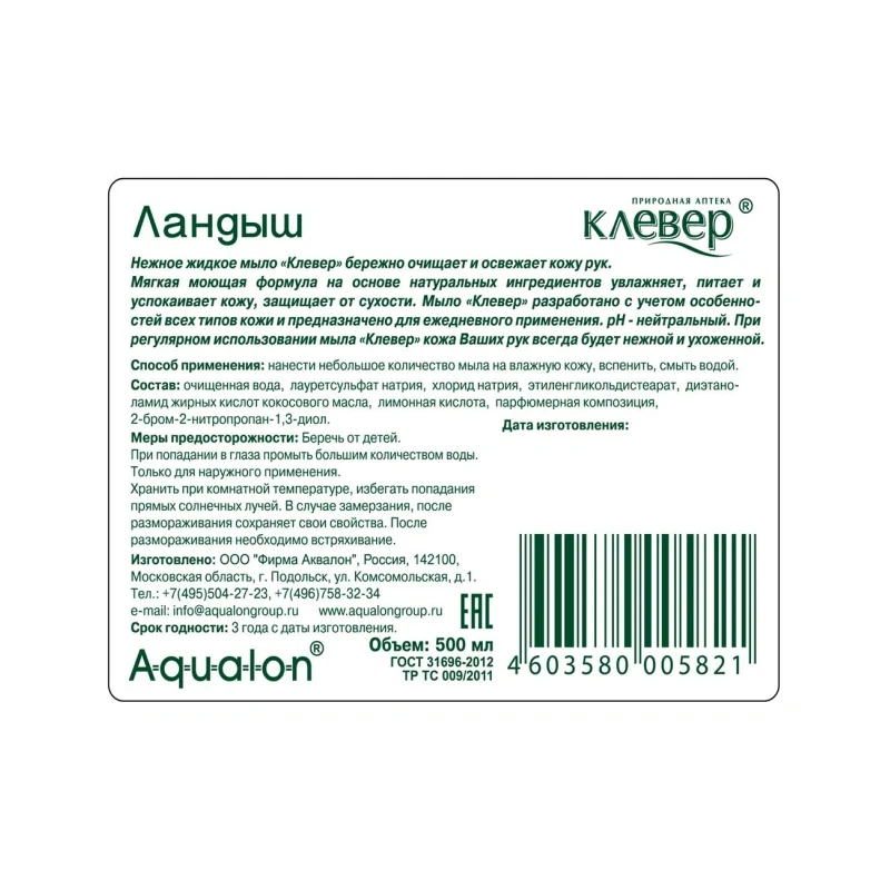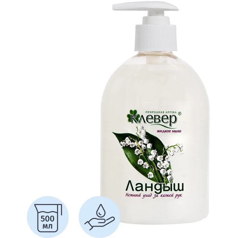 Мыло жидкое Клевер Ландыш 500 мл. Назначение: нежное перламутровое жидкое мыло Клевер бережно очищает от загрязнений, защищает и смягчает кожу рук и тела. Уникальная мягкая моющая формула на основе натуральных компонентов увлажняет и предотвращает сухость кожи. Обладает восхитительным ароматом ландыша. Разработано с учетом особенностей всех типов кожи и предназначено для ежедневного применения. pH-нейтрально. Меры предосторожности: хранить в недоступном для детей месте. При попадании в глаза промыть большим количеством воды. Только для наружного применения. Состав: очищенная вода, лауретсульфат натрия, хлорид натрия, этиленгликольдистеарат, диэтаноламид жирных кислот кокосового масла, лимонная кислота, парфюмерная композиция, 2-бром-2-нитропропан-1.3-диолитров. Условия хранения: хранить при комнатной температуре, избегать попадания прямых солнечных лучей. В случае замерзания после размораживания сохраняет свои свойства. После размораживания встряхнуть. Срок годности: 3 года с даты изготовления. Внешний вид и/или характеристики товара могут быть изменены производителем в соответствии с производственным процессом.