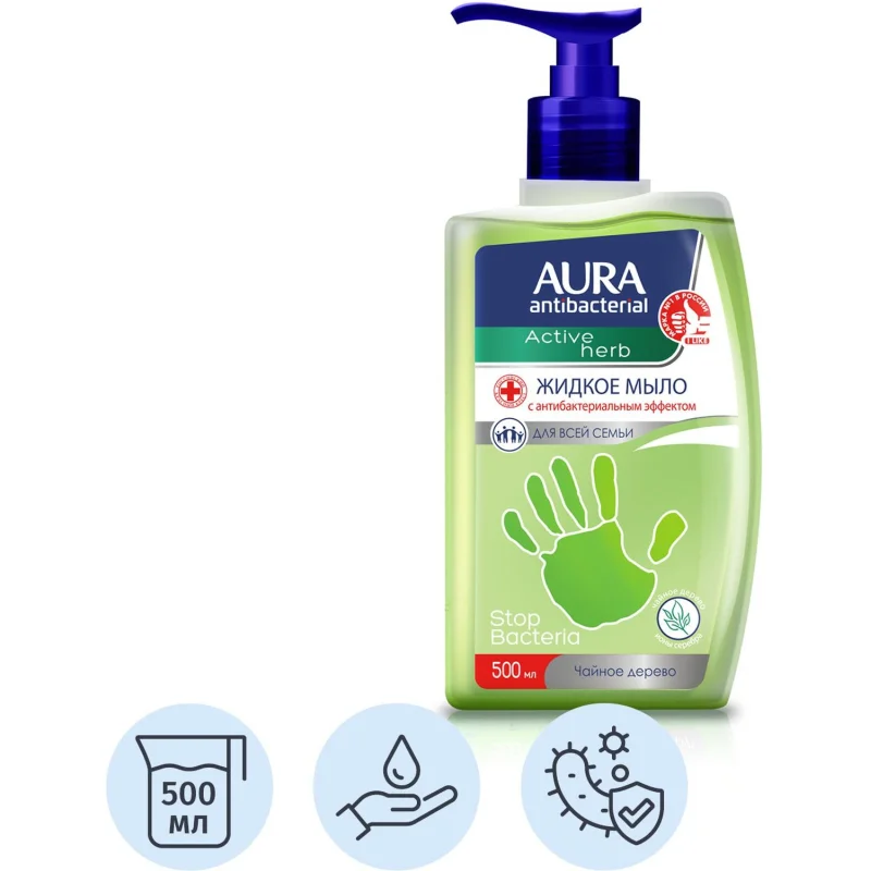 Aura Antibacterial Жидкое мыло с антибактериальным эффектом Active Herb Чайное дерево флакон/дозатор 500 мл КК/12. Назначение: жидкое мыло с антибактериальным эффектом Aura Antibacterial Active Herb c экстрактом чайного дерева и ионами серебра нежно очищает кожу рук, обеспечивая защиту от бактерий, сохраняя при этом естественный липидный баланс. Жидкое мыло содержит антибактериальный комплекс, в составе которого содержится: ионы серебра обеспечивают усиленную защиту, оказывая противомикробное и бактерицидное действие. Экстракт чайного дерева обладает антисептическими свойствами. Способствует повышению эластичности и упругости кожи. Urea эффективно увлажняет кожу, улучшая ее состояние. Снимает раздражение и успокаивает кожу. Дарит рукам приятный и свежий аромат зеленого чая. Мыло клинически и микробиологически протестировано. Продукция поддерживается Российским Красным Крестом. Подходит для ежедневного использования всеми членами семьи. Способ применения: небольшое количество жидкого мыла нанести на влажную кожу рук, вспенить, обработать руки не менее 60 секунд, затем тщательно смыть водой. Меры предосторожности: при обнаружении чувствительности к компонентам - прекратить использование. Только для наружного применения. Состав: aqua, Sodium Laureth Sulfate, Cocamidopropyl Betaine, Sodium Chloride, Silver Citrat, Cocamide DEA, Melaleuca Alternifolia (Tea Tree) Extract, Urea, Methylisothiazolinone, Methylchloroisothiazolinone, Parfum, Citric Acid, Cl 19140, Cl 42090. Условия хранения: хранить при температуре от +5 до +25 градусов Цельсия. Срок годности: 3 года. Внешний вид и/или характеристики товара могут быть изменены производителем в соответствии с производственным процессом.