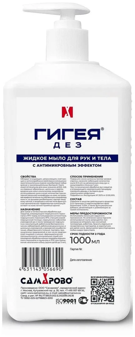 Гигея 1л с дезинфицирующим эффектомЖидкое мыло предназначено для бытового и профессионального использования.За счет дезинфицирующих свойств его можно применять на предприятиях пищевой промышленности, в медицинских учреждениях, на объектах транспорта и т.д.Активное вещество мыла - 2,4,4-трихлоро-2-гидроксидифенил эфир (триклозан) с концентрацией 0,25%. Кроме него в составе предусмотрены функциональные добавки и вещества, защищающие руки от пересушивания. Мыло деликатно контактирует с кожей, увлажняет ее.Срок годности: 24 месяца