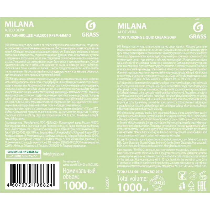 Жидкое мыло с дозатором Grass Milana 1л, алоэ вера, 126601