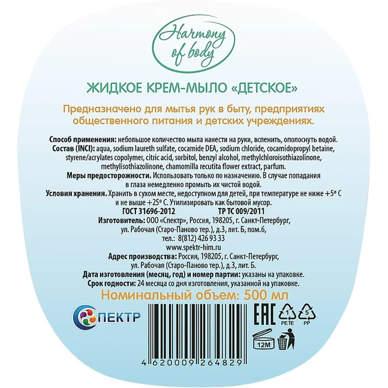 Крем-мыло Harmony of Body Детское 500 мл. Назначение: предназначено для мытья рук в быту, предприятиях общественного питания и детских учреждениях. Гипоаллергенное, увлажняющее, без парабенов, без силиконов, без красителей. Способ применения: небольшое количество мыла нанести на руки, вспенить, ополоснуть водой. Меры предосторожности: использовать только по назначению. В случае попадания в глаза, немедленно промыть их чистой водой. Состав: aqua, sodium laureth sulfate, cocamide DEA, sodium chloride, cocamidopropyl betaine, styrene/acrylates copolymer, citric acid, sorbitol, benzyl alcohol, methylchloroisothiazolinone, methylisothiazolinone, chamomilla recutita flower extract, parfum. Условия хранения: хранить в сухом месте, недоступном для детей, при температуре не ниже 5C и не выше 25C. Утилизировать как бытовой мусор. Срок годности: 24 месяца с даты изготовления при соблюдении условий хранения. Внешний вид и/или характеристики товара могут быть изменены производителем в соответствии с производственным процессом.