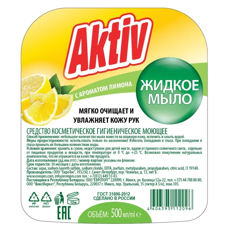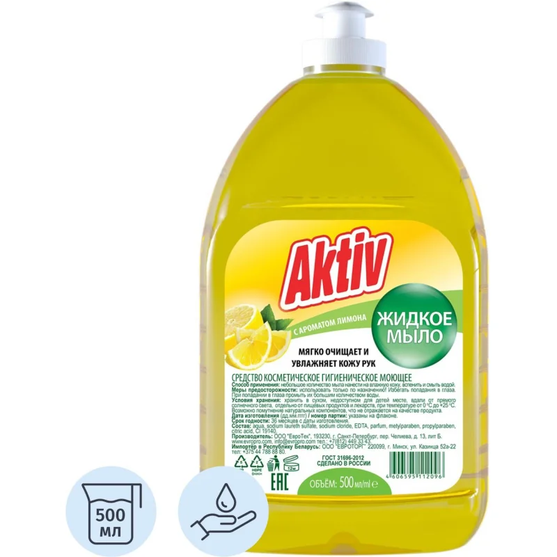 Мыло жидкое Mister Dez Aktiv Лимон 500 мл. Назначение: густое жидкое мыло обладает прекрасным ароматом, удаляет любой запах и нежно очищает кожу рук. Возможна комплектация с дозатором или с пуш-пулом. Способ применения: нанести небольшое количество мыла на влажную кожу, вспенить, смыть водой. Меры предосторожности: беречь от детей! При попадании в глаза промыть большим количеством воды. Только для наружного применения. Состав: aqua, sodium laureth sulfate, sodium cloride, EDTA, parfum, metylparaben, propylparaben, citric acid, CI 19140. Условия хранения: хранить при комнатной температуре, избегать попадания прямых солнечных лучей. Хранить при температуре от 0 до +25 градусов Цельсия. Срок годности: 36 месяцев с даты изготовления. Внешний вид и/или характеристики товара могут быть изменены производителем в соответствии с производственным процессом.