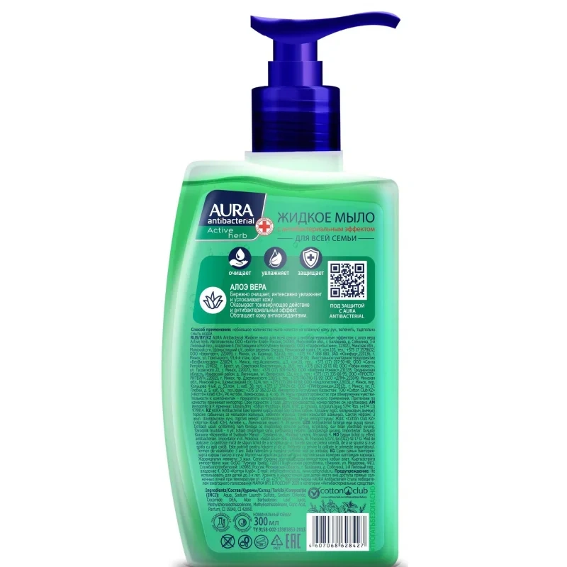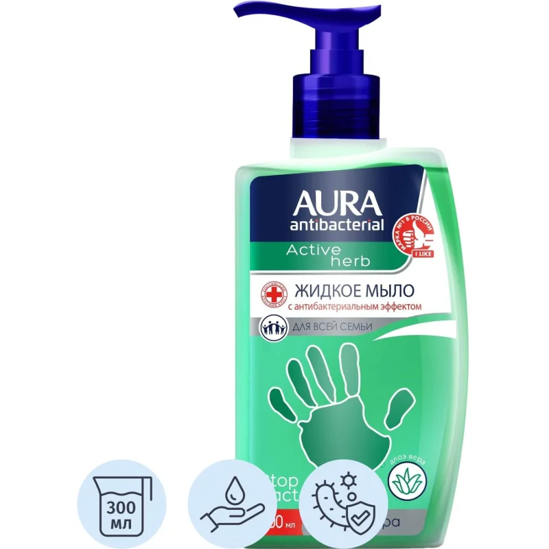 Жидкое мыло с дозатором Aura Antibacterial 300мл, с алоэ вера