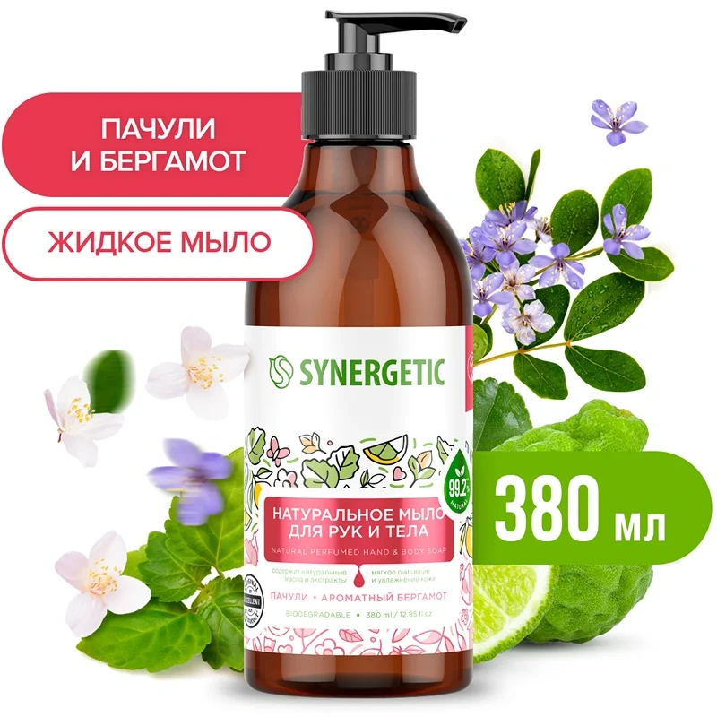 Мыло жидкое для рук и тела Synergetic Натуральное пачули и ароматный бергамот, 380мл