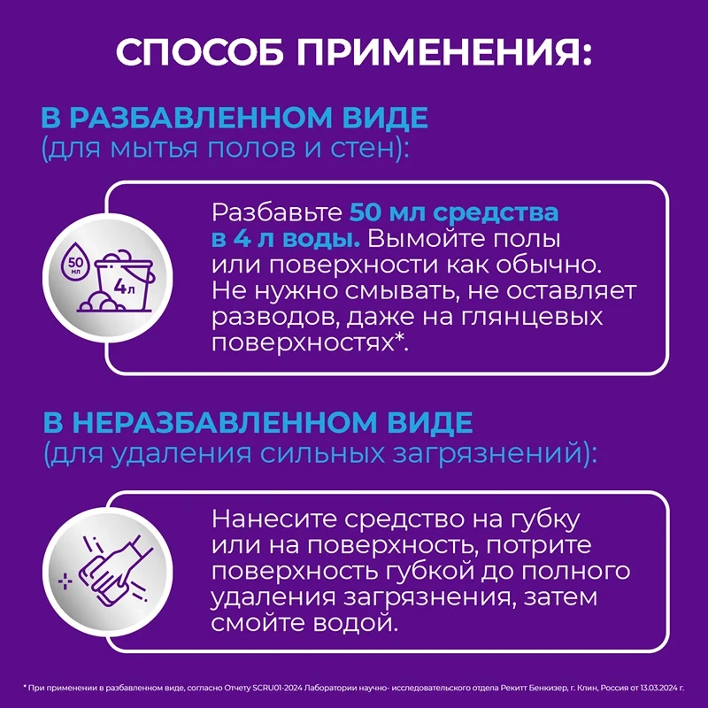 Это идеальное решение для тех, кто хочет сохранить чистоту и свежесть в доме. Оно не только эффективно удаляет грязь и пыль, но и придает поверхности блеск, оставляя после себя приятный аромат свежести. Уникальная формула содержит в составе дезинфицирующий компонент, позволяя не только очищать поверхности, но и заботится о своем здоровье и здоровье близких. Моющее средство предназначено для мытья и дезинфекции всех видов полов и стен. Средство быстро растворяется в воде, не требует смывания. Сохраняет блеск без разводов. Подходит для использования в холодной воде. Не содержит хлора. После уборки остается приятный аромат и свежесть.