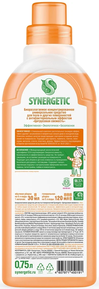 Биоразлагаемое концентрированное средство Synergetic Цитрусовая свежесть - универсальное средство для ежедневной и генеральной уборки пола и других поверхностей от любых видов загрязнений. Уникальный комплекс растительных тензидов эффективно удаляет загрязнения и неприятные запахи даже в холодной воде. Комплекс зеленых хелатов предотвращает повторное оседание загрязнений на поверхности. Подходит для паркета, ламината, плитки, линолеума, металла, стекла, пластика и дерева. Эффективность средства подтверждена в Европе.