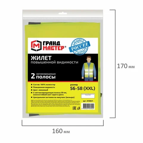 Жилет сигнальный, 2 светоотражающие полосы, ЛИМОННЫЙ, XXL (56-58), ЭКОНОМ, ГРАНДМАСТЕР, 610841