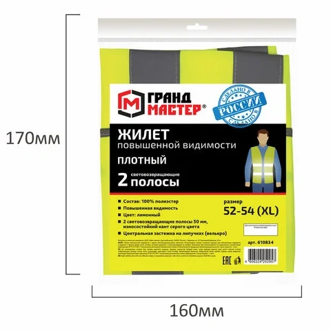 Жилет сигнальный ГОСТ, 2 светоотражающие полосы, ЛИМОННЫЙ, XL (52-54), ПЛОТНЫЙ, ГРАНДМАСТЕР, 610834
