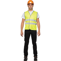 Материал изделия — 100% полиэфир, плотность ткани составляет 120 г/кв.м. Модель выполнена с учетом плотного облегания поверх верхней одежды, для удобства и свободы движений. Ширина светоотражающей ленты — 50 мм, всего предусмотрено 2 светоотражающих полосы, что соответствует второму классу защиты по стандартам безопасности.