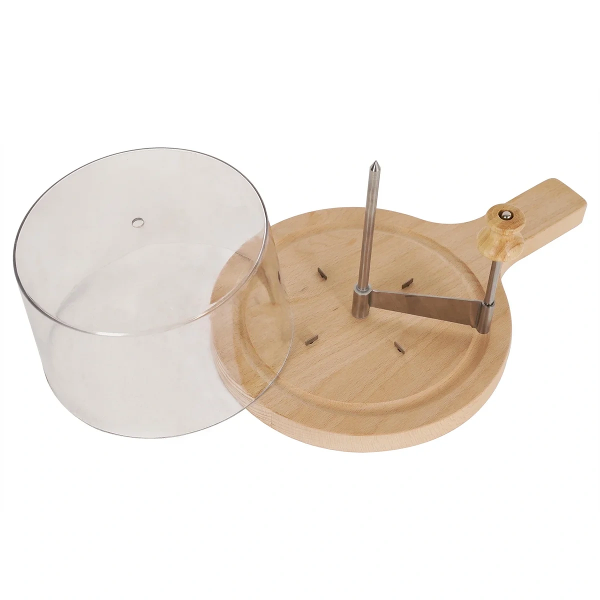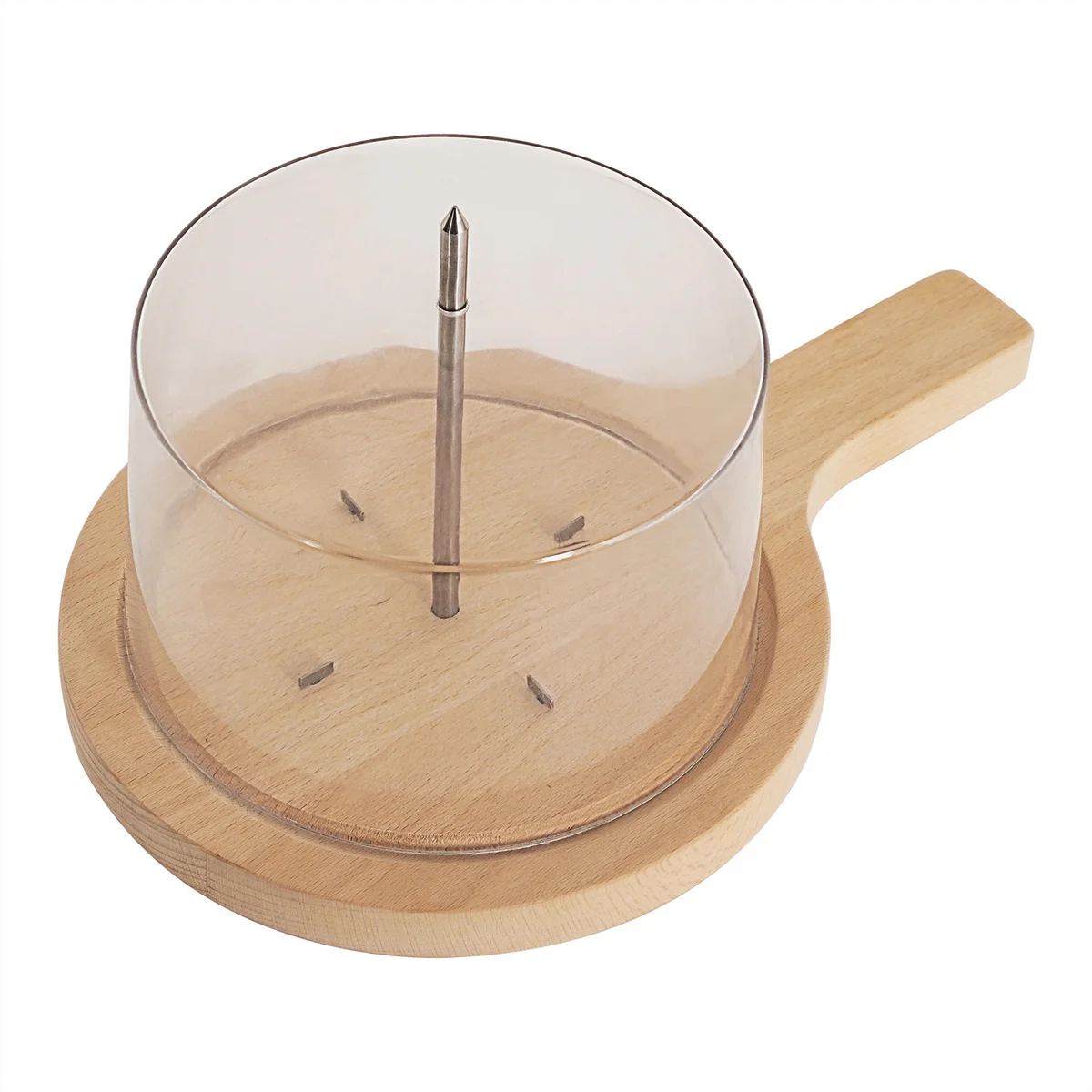 Жироль - это уникальный инструмент, специально предназначенный для нарезки деликатесных сортов сыра, таких как Эдам, Petit Basque, или твердые копченые сыры. Кроме того, жироль можно использовать для создания шоколадных завитков, идеально подходящих для украшения домашней выпечки. При вращении жироль создает тонкую стружку, которая напоминает кружевные розочки, добавляя эстетическую изюминку вашим блюдам. Способ использования: Отрежьте верхнюю часть (корку) у целой головки сыра. Наденьте сыр на стержень, а сверху закрепите нож с ручкой. Во время вращения не нужно сильно надавливать на сыр - усилий для нарезки тонких ломтиков потребуется совсем немного. Комплектация: доска деревянная с ручкой 21х31х2 см, колпак акриловый 17х11 см, нож с ручкой.