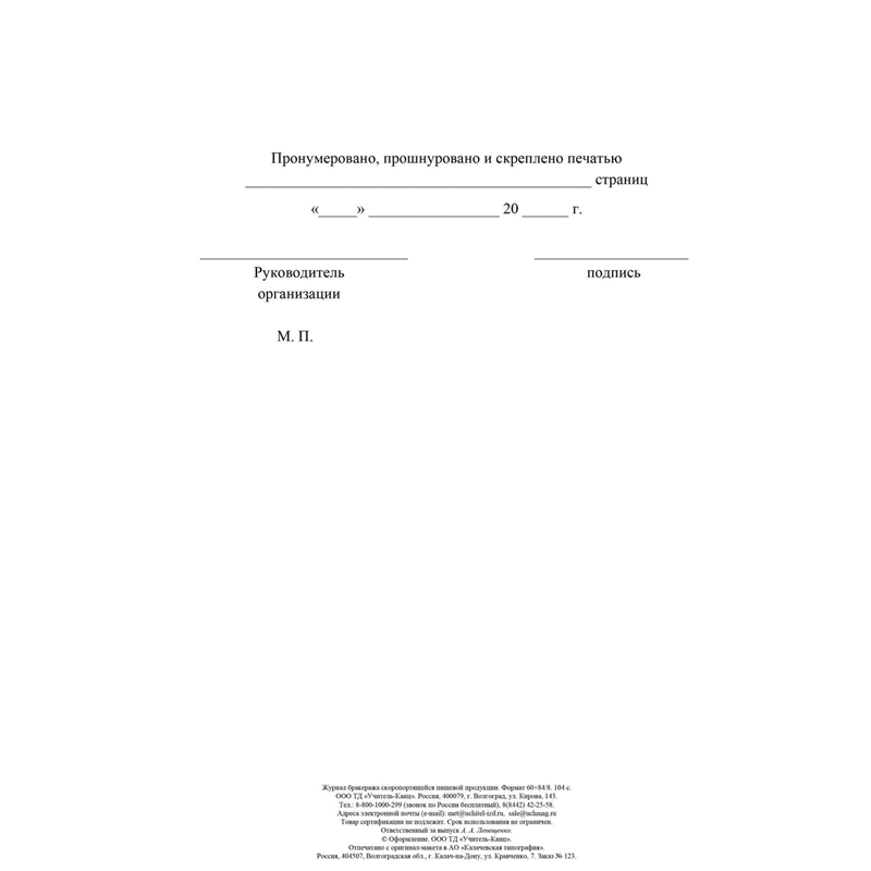 Журнал бракеража скоропортящейся пищевой продукции Учитель-Канц , А4, 32л., обложка офсет, блок писч