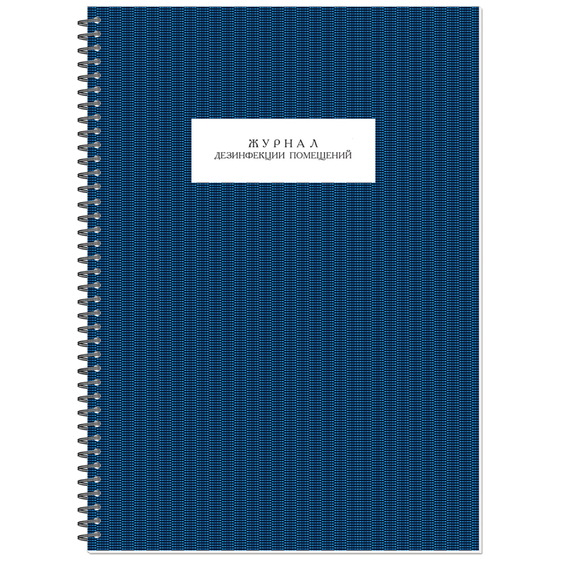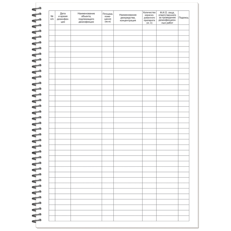 Журнал дезинфекции помещений А4 формата на металлическом гребне. Блок – офсетный, 65 г/м2, 50 листов. Обложка — мелованный картон.