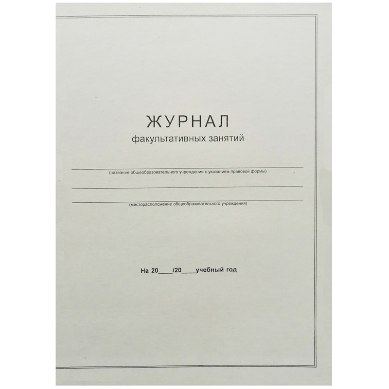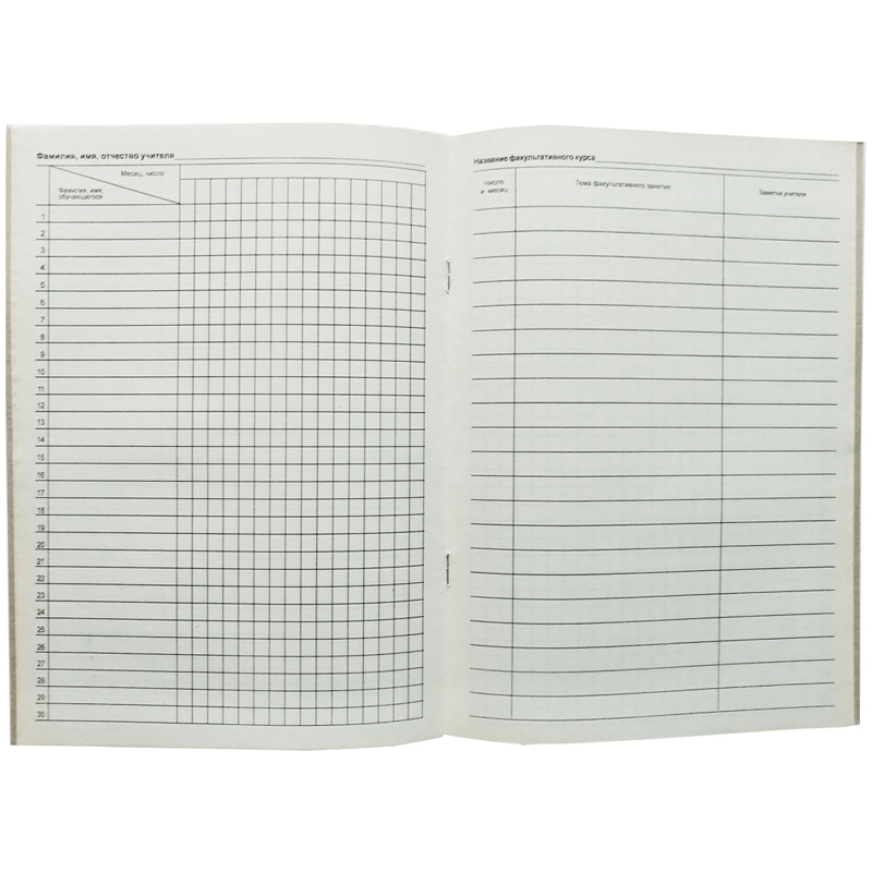 Журнал факультативных занятий в образовательной организации предназначен для фиксирования состава группы учащихся, результатов педагогической деятельности. Обложка – немелованный картон плотностью 220 г/м2. Вид крепления – скрепка. Внутренний блок – офсетная бумага плотностью 50-55 г/2, 24 листа. Линовка – оригинальный блок с табличной частью.