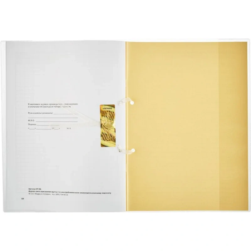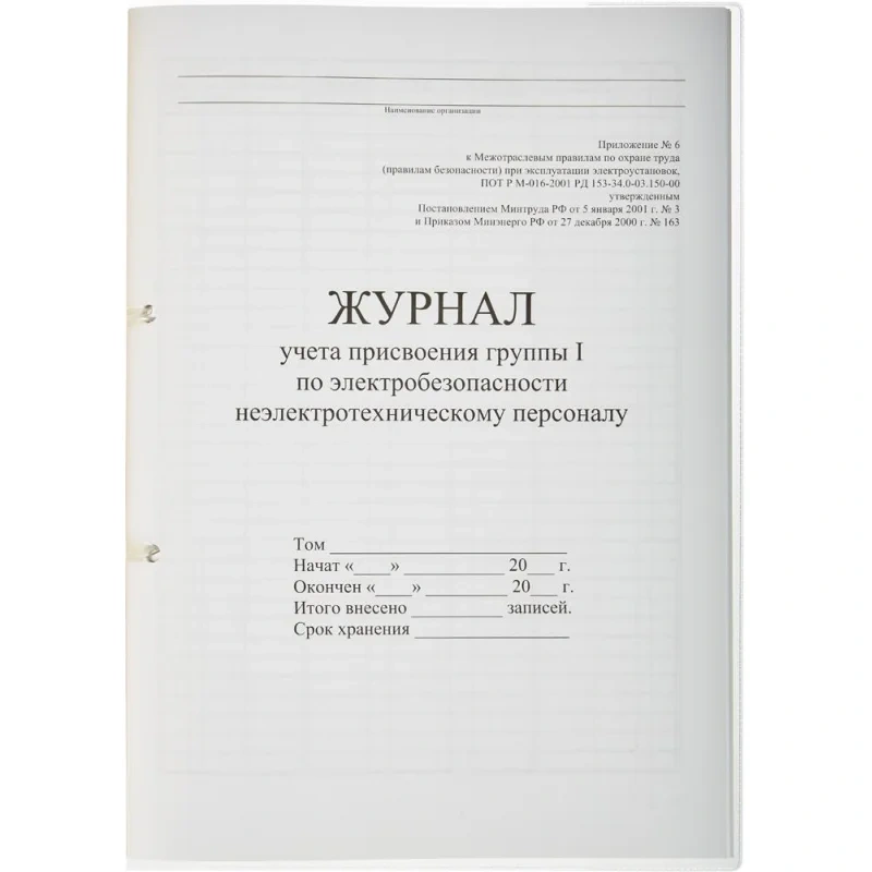 Журнал учета присвоения I группы по электробезопасности прошнурован и опломбирован, страницы журнала пронумерованы. Журнал имеет обложку из плотного картона золотистого цвета, а также дополнительную съемную обложку из ПВХ. Форма Журнала учета присвоения первой группы по электробезопасности неэлектротехническому персоналу установлена Межотраслевыми правилами по охране труда (правила безопасности) при эксплуатации электроустановок (ПОТ Р