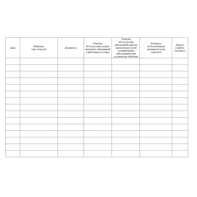 В журнале указываются дата осмотра, ФИО и должность сотрудника, ставятся отметки об отсутствии/присутствии болезней кожи или верхних дыхательных путей, слизистой, наличие кишечных заболеваний в семье работника, ставится отметка о допуске или не допуске.