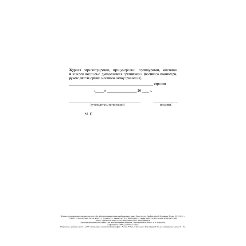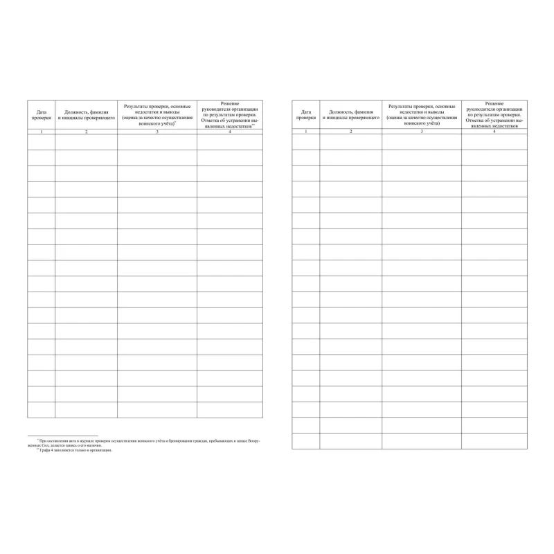 Журнал проверок осуществления воинского учета и бронирования граждан, пребывающих в запасе Вооруженных Сил Российской Федерации имеет форму, утвержденную Приказом Министра обороны Российской Федерации от 22 ноября 2021 г. 700 «Об утверждении Инструкции об организации работы по обеспечению функционирования системы воинского учета» (п. 62 Приложения 29 к Инструкции).