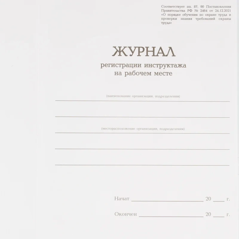 Журнал регистрации инструктажа на рабочем месте, бумвинил, 96 листов, выполнен Согласно Постановлению Правительства РФ № 2464 от 24.12.2021 «О порядке обучения охране труда и проверки знания требований охраны труда», обложка изготовлена из переплетного картона толщиной 1,5 мм (850 г/м плотность), обклеена бумвинилом. Название журнала выполнено тиснением фольгой, внутренний блок на сшивке офсет 60 г/м. В гофрокоробе 10 штук.