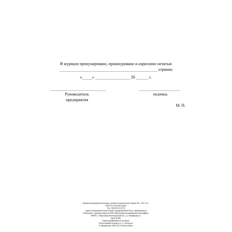 Журнал регистрации несчастных случаев на производстве соответствует форма 9 приложения 1 к Постановлению Минтруда России от 24.10.2002 N 73 «Об утверждении форм документов, необходимых для расследования и учета несчастных случаев на производстве, и положения об особенностях расследования несчастных случаев на производстве в отдельных отраслях и организациях». Все происшествия, которые можно квалифицировать как несчастные случаи на производстве фиксируются в данном журнале. Журнал «Учитель-Канц» регистрации несчастных случаев на производстве подлежит хранению в организации в течение 45 лет.