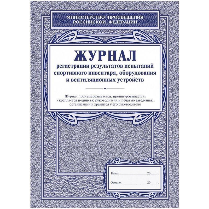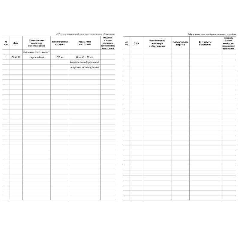 Журнал регистрации результатов испытаний спортивного инвентаря, оборудования и вентиляционных устройств соответствует Приложению 4 Минобрнауки России от 18.10.2013 N ВК-710/09 «О Рекомендациях по безопасности эксплуатации физкультурно-спортивных сооружений общеобразовательных организаций, спортивного оборудования и инвентаря при организации и проведении физкультурно-оздоровительных и спортивно-массовых мероприятий с обучающимися». Испытания спортивного оборудования в физкультурном зале и на спортивной площадке производятся перед началом учебного года и фиксируются в журнал.