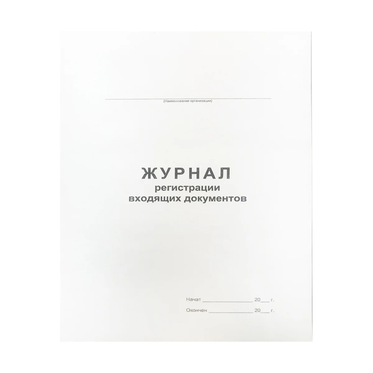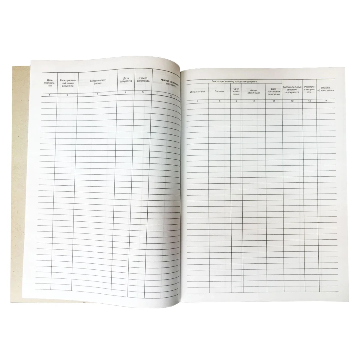 Журнал для регистрации входящих документов. Книга формата А4 выполнена в размере 290*250мм. Внутренний блок изготовлен из 48 листов офсетной бумаги плотностью 55 г\\м2 в табличную линовку. Крепление – скрепка. Мягкая обложка изготовлена из картона белого цвета плотностью 200-220 г/м2. Книга имеет вертикальную ориентацию.