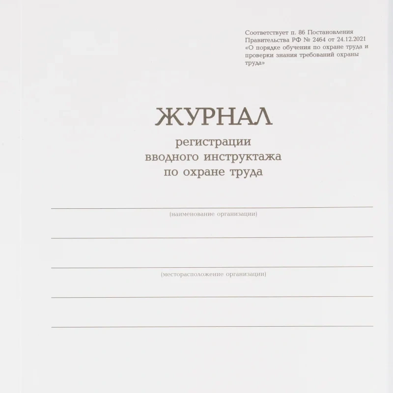 Журнал регистрации вводного инструктажа по охране труда, бумвинил, 96 листов, офсет. Выполнен Согласно Постановлению Правительства РФ № 2464 от 24.12.2021 «О порядке обучения охране труда и проверки знания требований охраны труда», обложка изготовлена из переплетного картона толщиной 1,5 мм (850 г/м плотность), обклеена бумвинилом. Название журнала выполнено тиснением фольгой, внутренний блок на сшивке офсет 60 г/м. В гофрокоробе 10 штук.