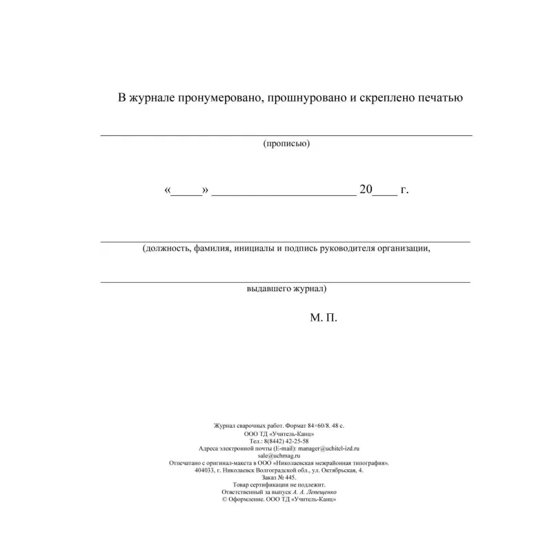 Журнал «Учитель-Канц» размером 197×285 мм. Журнал сварочных работ — важный документ в работе профессиональных строителей. В этом реестре сотрудником ведется учет всех проводимых сварочных работ на объекте. Вести его имеет право только сварщик третьего разряда и выше. Приказ о его ведении издается руководителем и подписывается сотрудником, который назначен для его ведения.