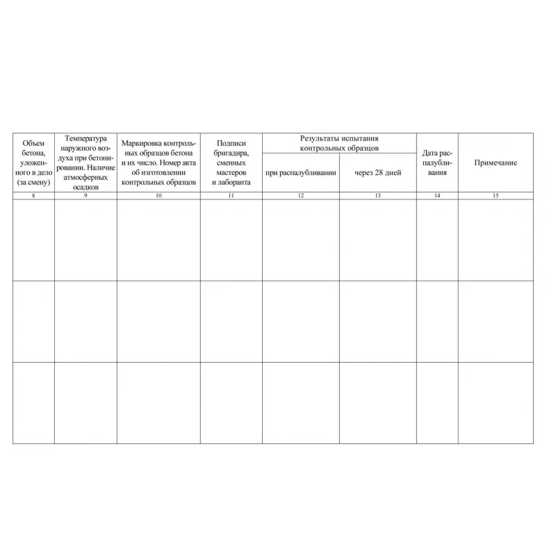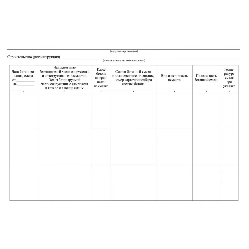 Журнал бетонных работ ведется лицами, ответственными за выполнение этих работ, и заполняется во время производства бетонных работ ежесменно. По окончании ведения журнала бетонных работ он сдается в производственно-технический отдел строительной организации, который делает отметку о приемке в таблице 4 общего журнала работ. В журнале указывается подрядная организация, а также наименование и месторасположение строительства (реконструкции).