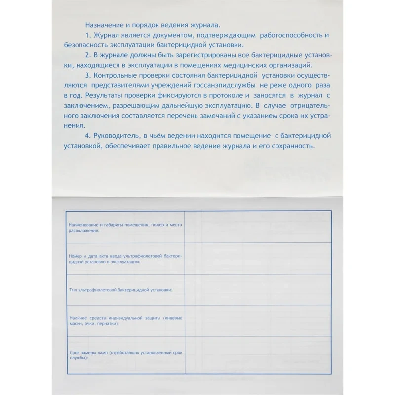 Производство: Россия, ООО НПФ 'ВИНАР'. Ведение журнала контроля работы бактерицидной установки регламентируется Руководством 3.5.1904-04 Использование ультрафиолетового бактерицидного излучения для обеззараживания воздуха в помещениях. Согласно данным руководства, все помещения с действующими или вводимыми вновь бактерицидными установками, должны иметь журнал регистрации и контроля бактерицидных установок. В журнале ведётся учет времени работы облучателей и измерения длительности облучения. Органы Роспотребнадзора, при проведении проверок помещений с бактерицидными установками, в первую очередь,проверяют наличие вышеуказанного журнала и правильность его ведения. Бактерицидные установки должны использоваться в помещениях с повышенным риском распространения возбудителей инфекций, вследствие возможного микробного загрязнения воздушной среды и поверхностей в лечебно-профилактических, производственных и общественных учреждениях. Использование бактерицидных установок требует строгого выполнения мер безопасности, исключающих возможное вредное воздействие на человека ультрафиолетового бактерицидного излучения, озона и паров ртути. Журнал регистрации и контроля бактерицидной установки является официальным документом, подтверждающим работоспособность и безопасность эксплуатации бактерицидной установки. В журнале должны быть зарегистрированы все бактерицидные установки, находящиеся в эксплуатации в медицинских учреждениях, в производственных и служебных помещениях, а также служб быта. Контрольные проверки состояния бактерицидной установки осуществляются представителями органов или служб Госсанэпиднадзора не реже одного раз в год. Результаты проверки фиксируются в протоколе и заносятся в журнал с заключением, разрешающим дальнейшую эксплуатацию. В случае отрицательного заключения составляется перечень замечаний с указанием срока их устранения. Ответственность за правильное ведение журнала и его сохранность несет администрация, в чьем ведении находится помещение с бактерицидной установкой. Количество страниц - 40.Размер журнала - А4 в сложенном виде.