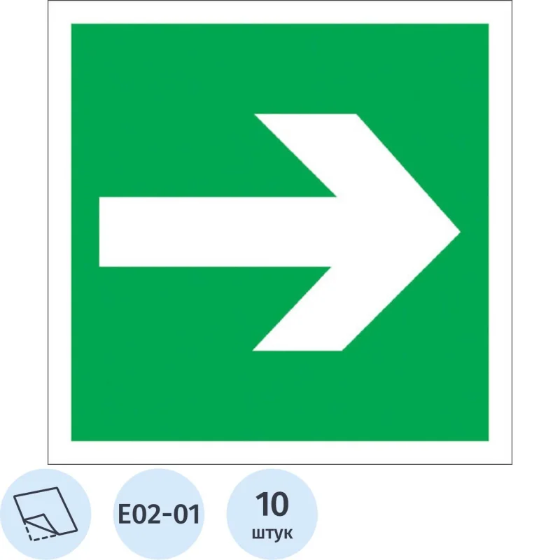 Эвакуационный знак безопасности (наклейка) 'Направляющая стрелка'. Код знака: Е02-01. Место размещения (установки) и рекомендации по применению: использовать только вместе с другими эвакуационными знаками для указания направления движения. Используемые материалы: самоклеящаяся пленка ПВХ. Формат: 200?200 мм. Упаковка 10 шт.