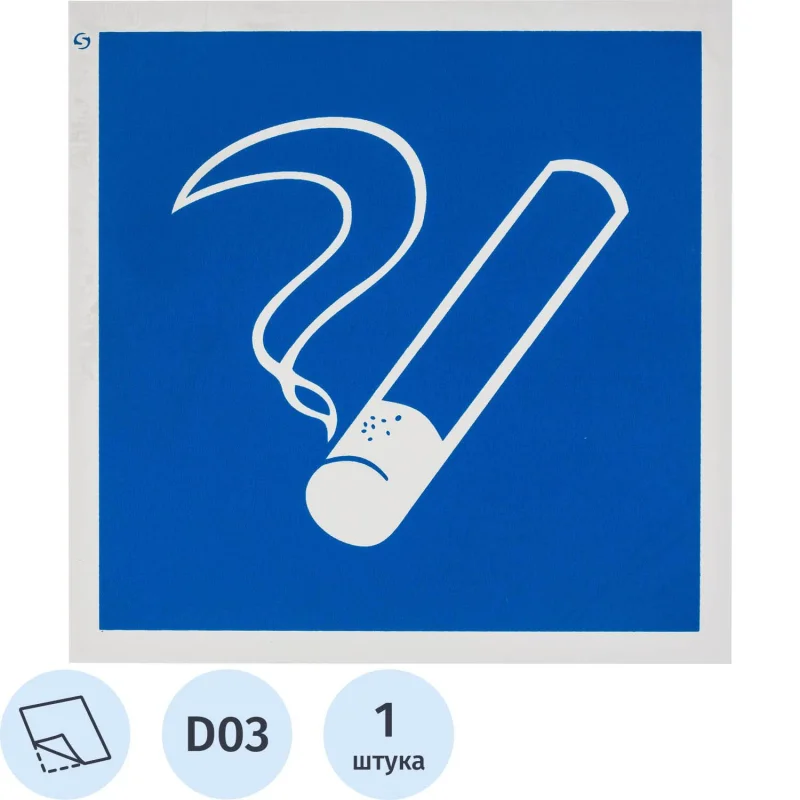 Знак безопасности Место курения D03 200×200 мм. Предназначенный для обозначения мест, где разрешено курение. Место курения Знак квадратной формы с белым изображением на голубом фоне хорошо держится на любой поверхности благодаря клеевой основе. Материал изготовления: самоклеящаяся пленка ПВХ. Стандарты: ГОСТ 12.4.026-2015.