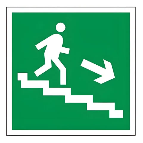 Знак эвакуационный 'Направление к эвакуационному Выходу по лестнице направо вниз' изготовлен в соответствии ГОСТ, отраслевыми нормами, правилами и инструкциями. Квадрат.