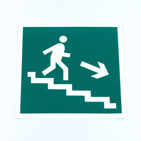 Эвакуационный знак 'Направление к эвакуационному выходу по лестнице вниз, направо' применяется в качестве пиктограммы (наклейки) для световых эвакуационных указателей. Знак предназначен для размещения на лестничных площадках, а также стенах, прилегающих к лестничному маршу. Эвакуационный знак изготовлен на белой самоклеящейся пленке.