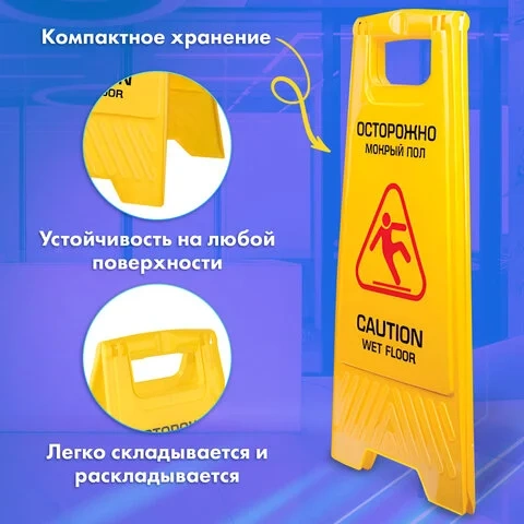Назначение:Раздвижная напольная информационная табличка «Внимание! Скользкий пол» представляет собой 2 панели с надписями, соединенными в верхней части. Имеет удобную ручку для переноски и хранения в подвешенном виде. Универсальное изделие предназначено для обеспечения безопасности посетителей во время влажной уборки торговых центров, ресторанов и других общественных учреждений. Изготовлена из пластика желтого цвета. Информация написана на русском и английском языках на внешней стороне каждой из двух пластин таблички, также есть упреждающие картинки. Надписи выполнены черным цветом, картинки — красного цвета. Устойчива на любом полу. Занимает мало места при хранении.