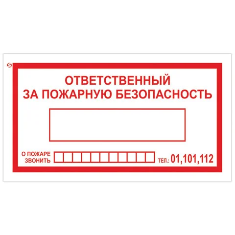 Знак вспомогательный 'Ответственный за пожарную безопасность' изготовлен в соответствии ГОСТ, отраслевыми нормами, правилами и инструкциями. Прямоугольник.