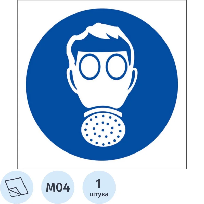 Предписывающий знак безопасности (наклейка) «Работать в средствах индивидуальной защиты органов дыхания»Код знака: М04Смысловое значение: Работать в средствах индивидуальной защиты органов дыханияМесто размещения (установки) и рекомендации по применению: на рабочих местах и участках, где требуется защита органов дыханияИспользуемые материалы: самоклеющаяся пленка ПВХРазмер 200x200ммЗнак круглой формы изготовлен на белой квадратной основе.