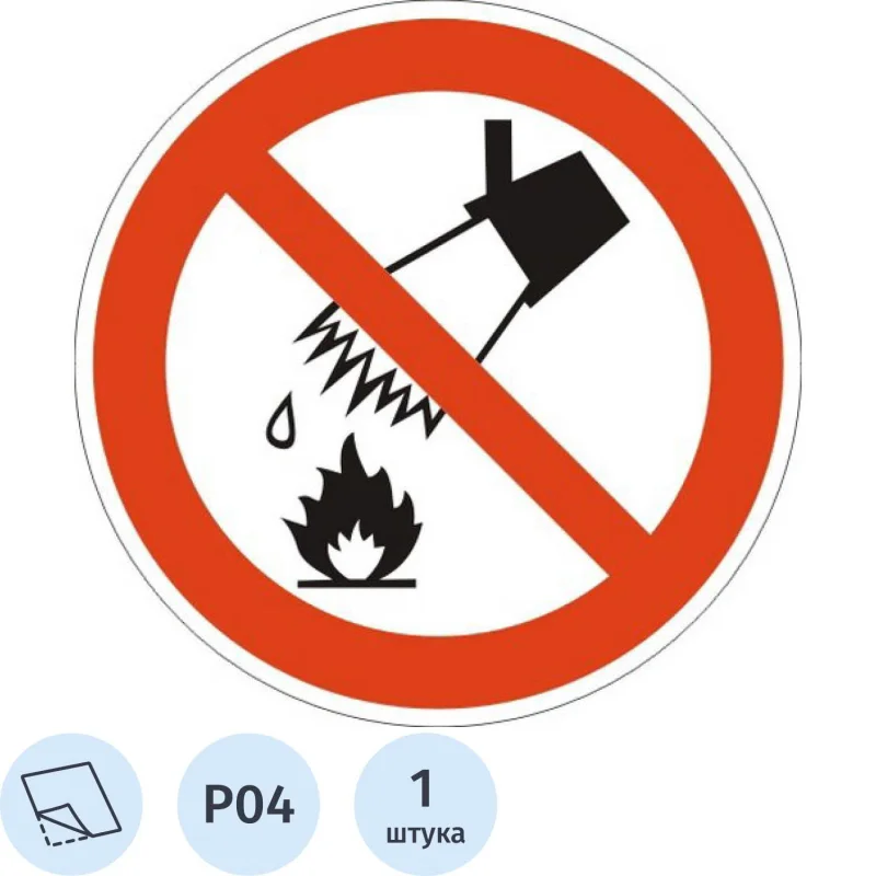 Знак безопасности Запрещается тушить водой P04 200х200 мм. Место размещения (установки) и рекомендации по применению: в местах расположения электрооборудования, складах и других местах, где нельзя применять воду при тушении горения или пожара Используемые материалы: самоклеящаяся пленка ПВХ. Знак круглой формы изготовлен на белой квадратной основе. Стандарты: ГОСТ 12.4.026-2015.