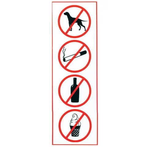 Знак Запрещается курить пить есть проходить с животными 100х300мм, самоклеящаяся пленка ПВХ, НП-В-Б