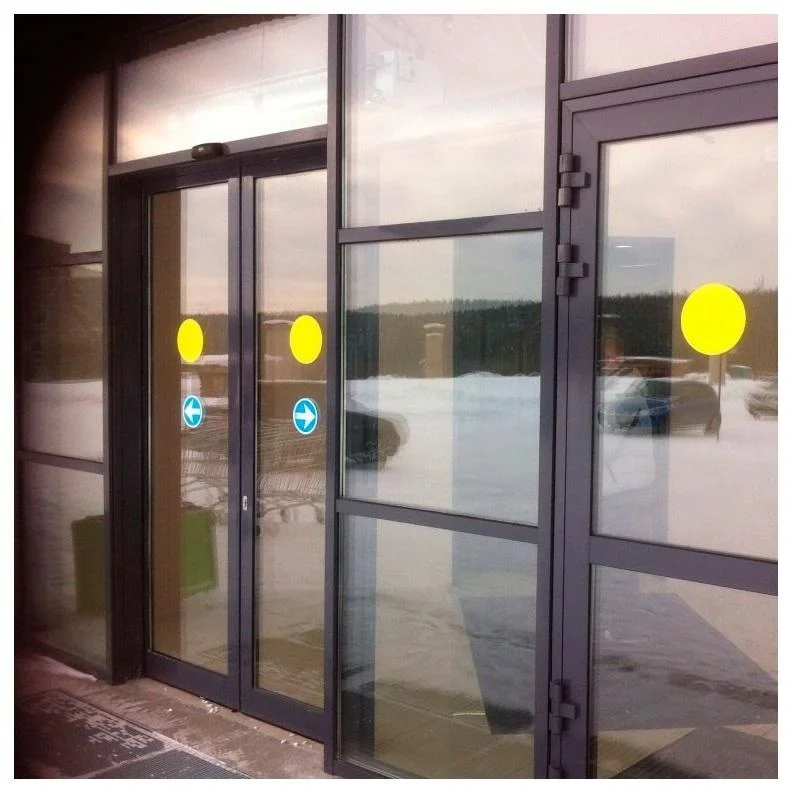 Знак безопасности Жёлтый круг на двери (плёнка, D150) уп.10шт Знак безопасности 'Желтый круг для слабовидящих'. Код знака: D150. Знак имеет однотонную желтую окраску с двух сторон. Таким образом, наклеивая одну наклейку на стекло дверей, вы маркируете ее как снаружи, так и изнутри. Материал изготовления: самоклеящаяся пленка ПВХ Диаметр: 150 мм. 10 штук в упаковке.
