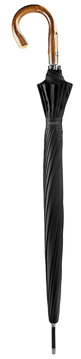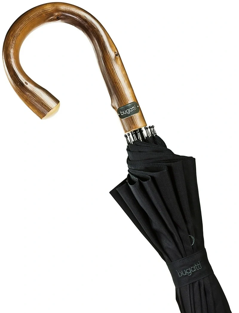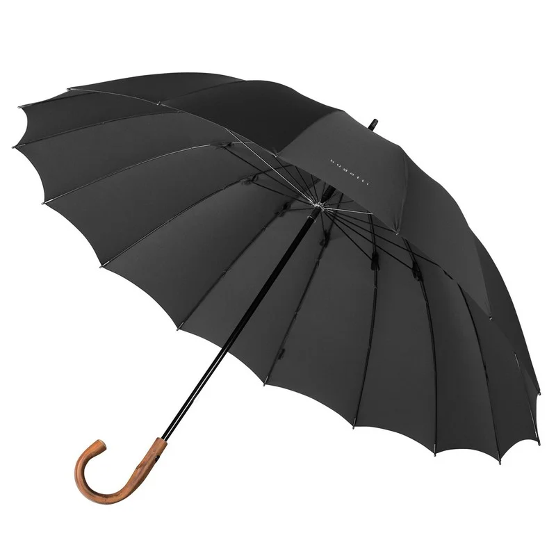 Солидный изысканный зонт с ручкой из дерева и 16 спицами. Большой купол легко укроет от дождя сразу двоих, а надежная конструкция выдержит даже сильный ветер. Механический зонт, поставляется без чехла. Размеры: длина 105 см, диаметр купола 131 см