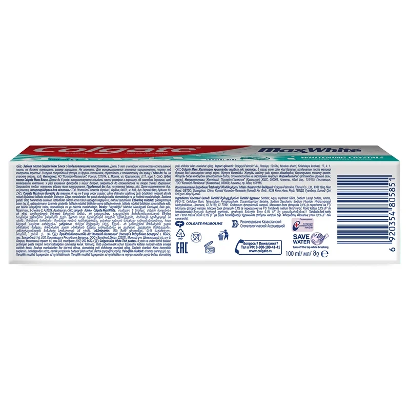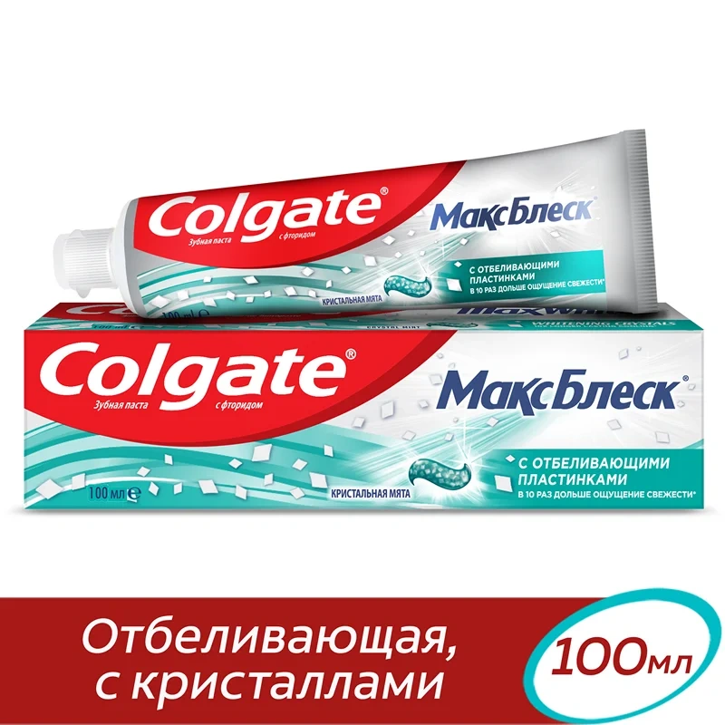 Отбеливающая зубная паста Colgate Макс Блеск не только сделает ваши зубы белее, но и подарит невероятное ощущение свежести для еще большей уверенности в себе. Отбеливает зубы — благодаря отбеливающим пластинкам в составе. Освежает дыхание — экстраосвежающая формула с передовой технологией интенсивно охлаждает, устраняет неприятный запах и дарит ощущение невероятной свежести. В 10 раз дольше ощущение свежести по сравнению с другими зубными пастами Colgate с фторидом. Помогает бороться с кариесом. Приятный вкус мяты.