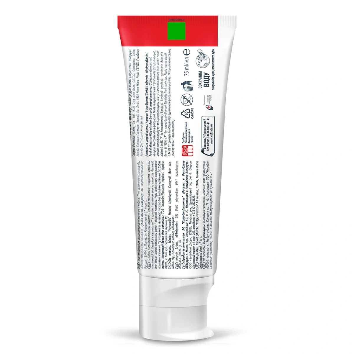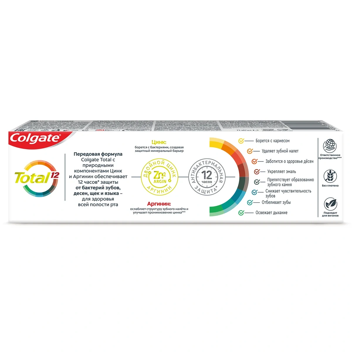 Для обеспечения здоровья всей полости рта необходима комплексная защита, а не только забота о зубах. Поэтому Colgate Total 12 Чистая Мята проактивно борется с бактериями не только на зубах, но и на языке, щеках и деснах в течение 12 часов, обеспечивая здоровье всей полости рта. Почувствуйте разницу с уверенной, яркой и здоровой улыбкой! Colgate Total 12 Чистая Мята содержит передовую формулу с Цинком и Аргинином — Цинк борется с бактериями, создавая защитный минеральный барьер, а Аргинин ослабляет структуру зубного налета и улучшает проникновение цинка. Она борется с бактериями не только на зубах, но и на языке, щеках и деснах в течение 12 часов. Новая формула обладает большим, чем когда-либо количеством преимуществ. Это значит, что это лучшая зубная паста для здоровья всей полости рта в линейке Colgate. Обеспечивает превосходную защиту от налета, признаков воспаления десен, потемнений на эмали, зубного камня и кариеса, а также обеспечивает дополнительные преимущества — борьбу с бактериями для защиты эмали, мгновенную нейтрализацию неприятного запаха изо рта и более длительное ощущение свежести.