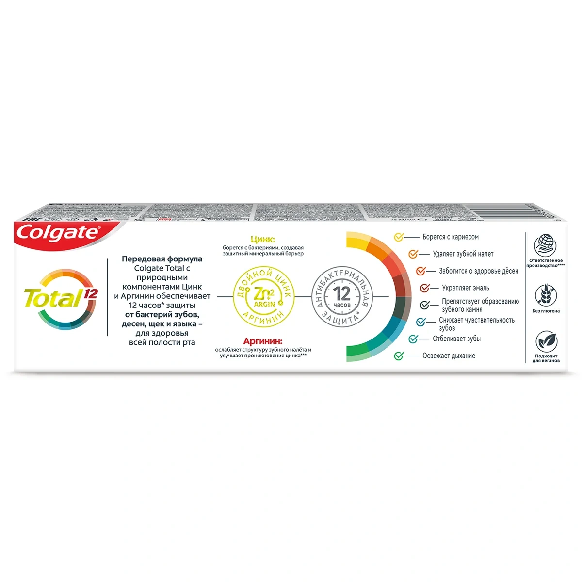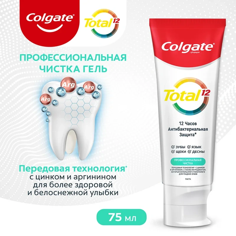 Для того, чтобы быть уверенным в своей яркой улыбке, начните со здоровья всей полости рта. Colgate Total 12 Профессиональная Чистка с гелевой структурой содержит специальный ингредиент, который используется стоматологами для гладких и блестящих зубов надолго. Теперь Colgate Total не только борется с бактериями на зубах, но и на языке, щеках и деснах и защищает их в течение 12 часов. Почувствуйте разницу с уверенной, яркой и здоровой улыбкой!