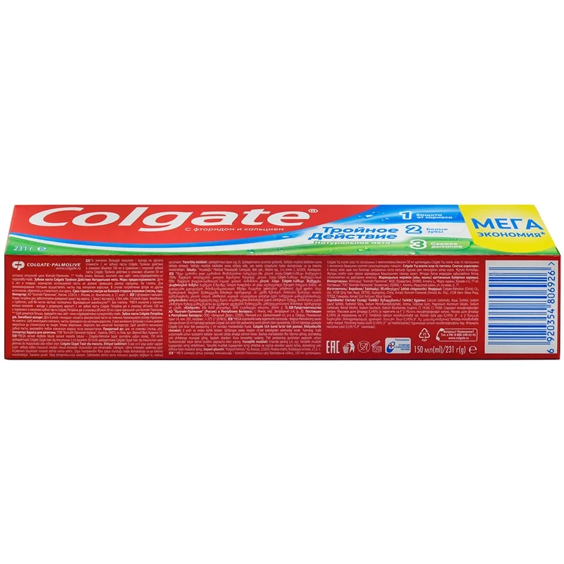 Трехцветная паста, разработанная для максимально эффективной защиты от кариеса. Благодаря уникальной формуле действует одновременно в трех направлениях: подавляет жизнедеятельность кариесогенных бактерий, удаляет потемнения с эмали, обеспечивает длительную свежесть дыхания. Хорошо пенится, поэтому экономично расходуется. Обладает мятным вкусом. Подходит для ежедневного использования. Одобрена стоматологической ассоциацией России. Постарайтесь чистить зубы минимум дважды в день – и результат вас приятно удивит. Среди продукции бренда Colgate вы непременно найдете средство, отвечающее именно вашим потребностям.