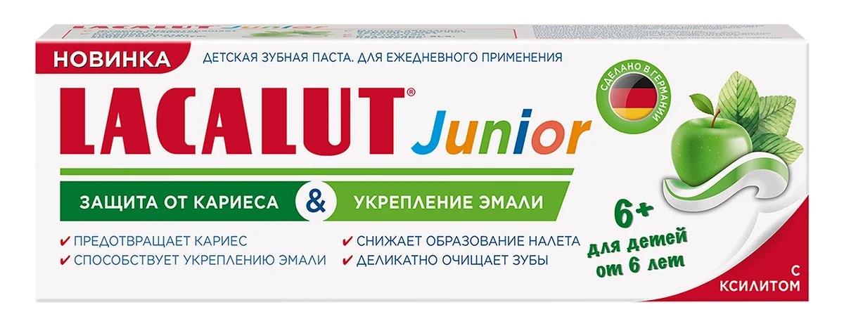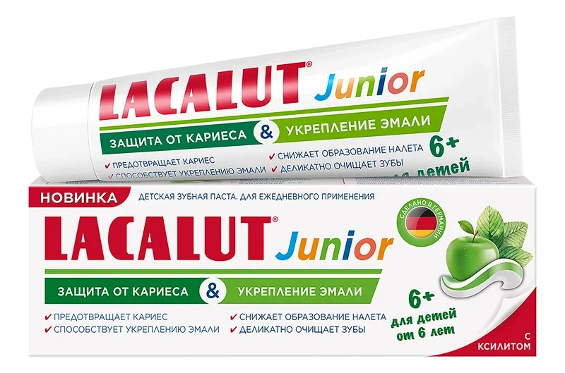 Детская зубная паста Lacalut Junior 6+ создана специально для ухода за зубами детей и подростков старше 6 лет. Свежий вкус яблока и мяты нравится детям. Фторид и ксилит реминерализуют эмаль и препятствуют образованию кариеса постоянных зубов, снижая образование бактериального налета. Кальций и гидроксиапатит укрепляют и полируют зубную эмаль. Мягкие абразивы бережно удаляют зубной налет.