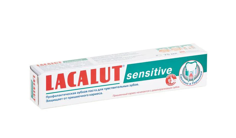 Профилактическая зубная паста для чувствительных зубов. Защита от пришеечного кариеса. Lacalut sensitive уменьшает болезненную чувствительность на раздражители горячее/холодное, кислое/сладкое и другие, вызванное истончением эмали. Уникальный компонент олафлур минерализует и укрепляет эмаль, защищает открытые шейки зубов. предохраняет от пришеечного кариеса. Лактат алюминия укрепляет десны и защищает от развития пародонтоза, поэтому Lacalut sensitive может применяться также на фоне воспаления десен.